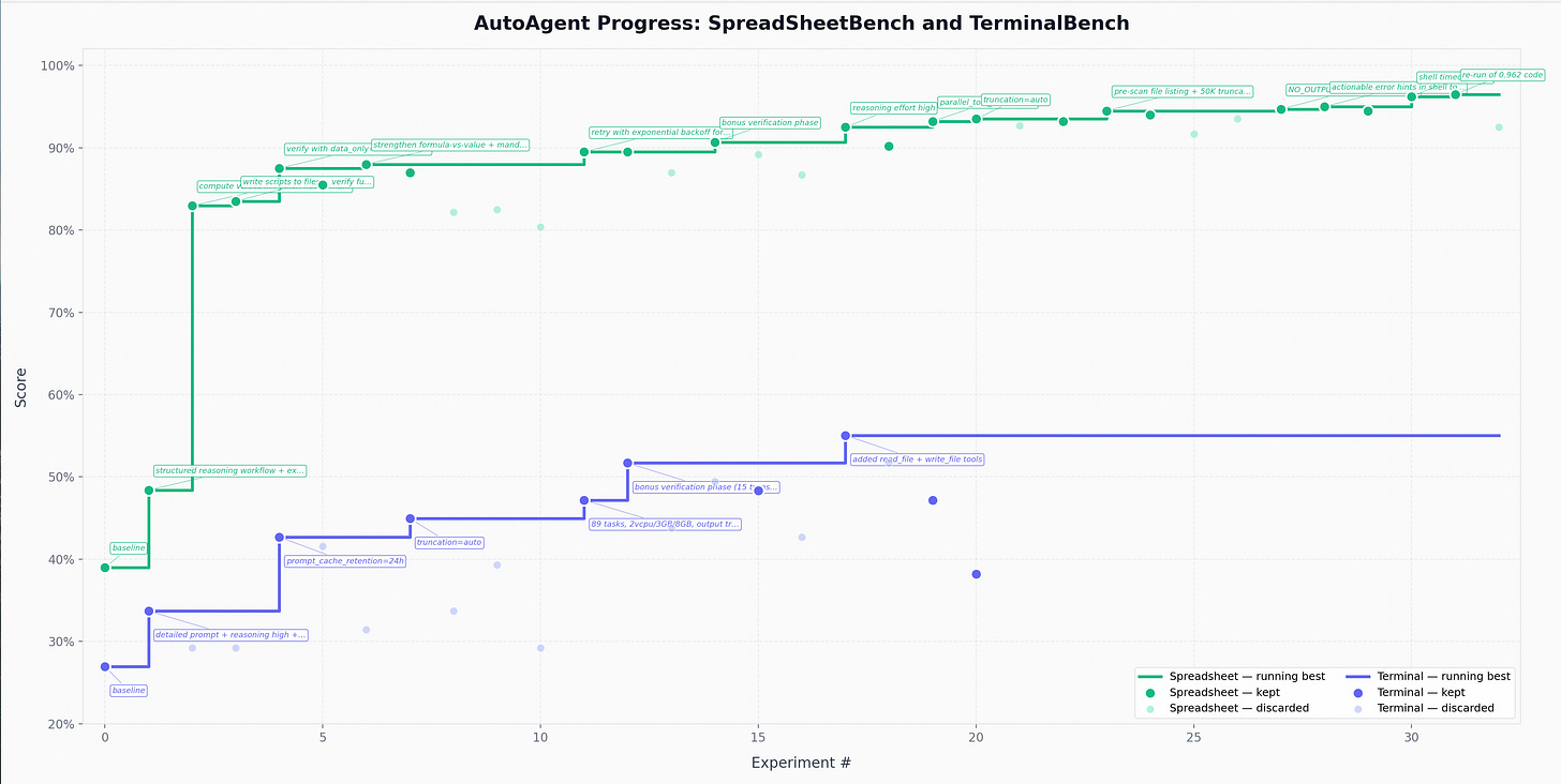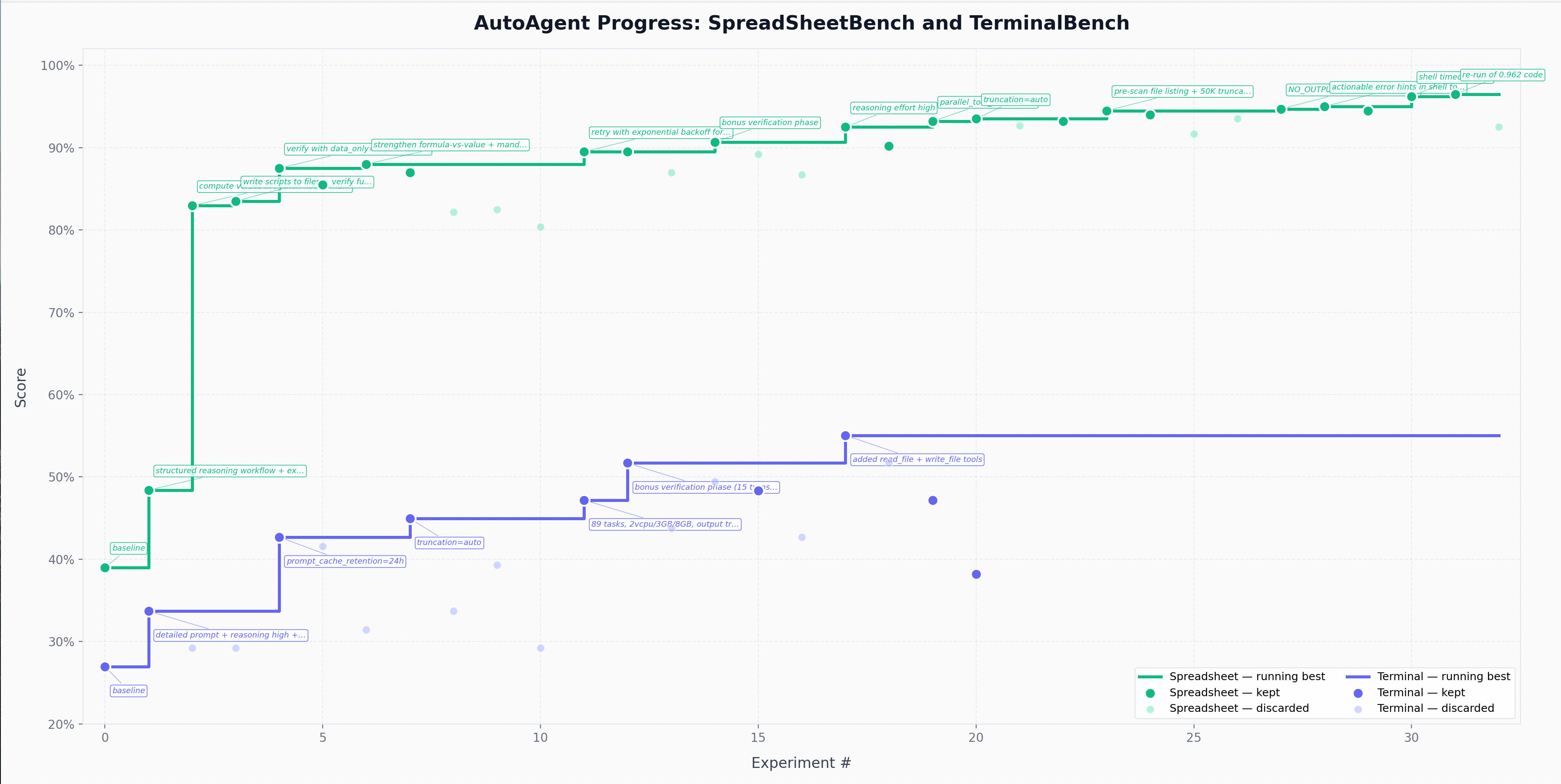 Trên các benchmark công khai, AutoAgent đạt 96.5% trên SpreadsheetBench và 55.1% GPT-5 score trên TerminalBench, hiện đứng đầu leaderboard – trong khi các entry khác đều do con người thiết kế harness thủ công.